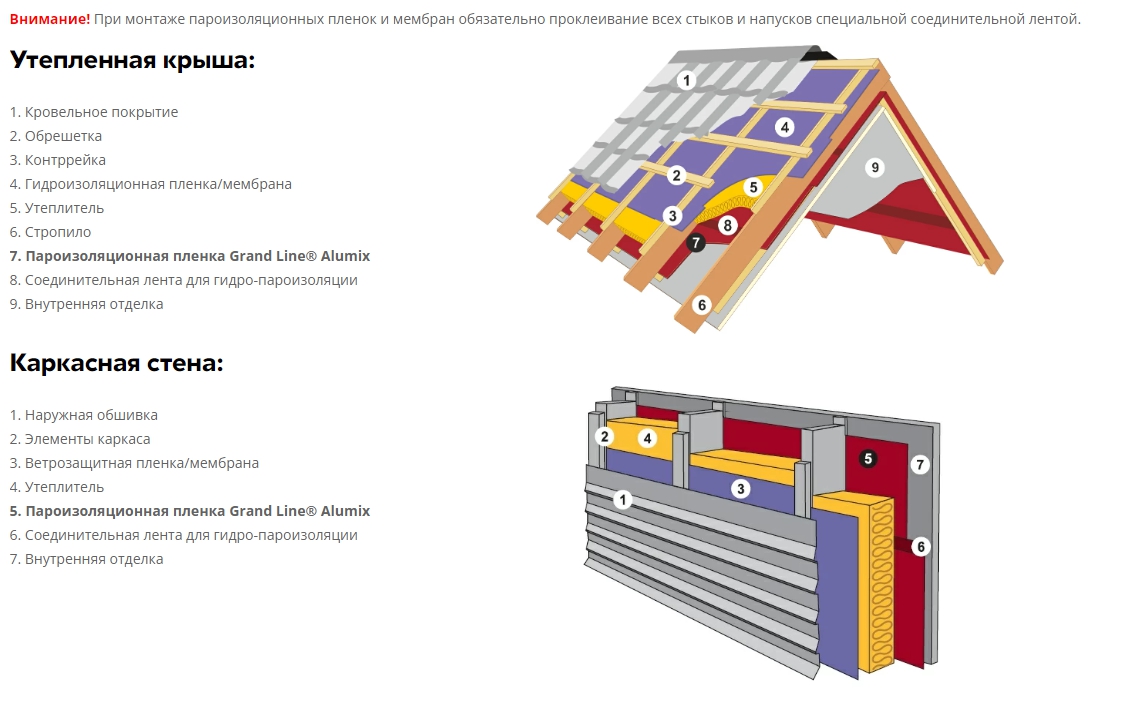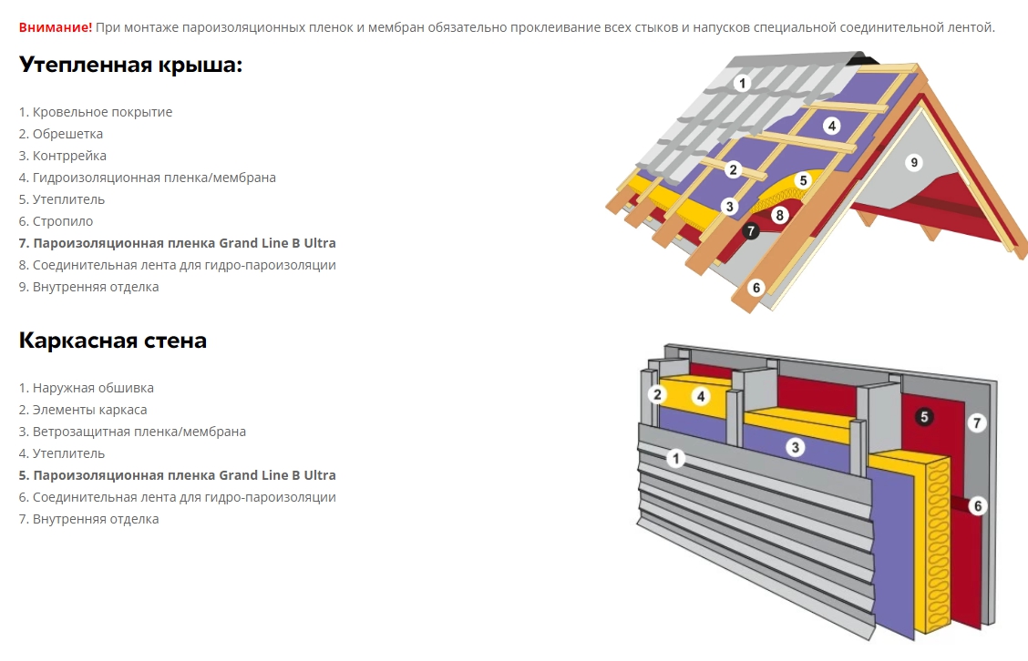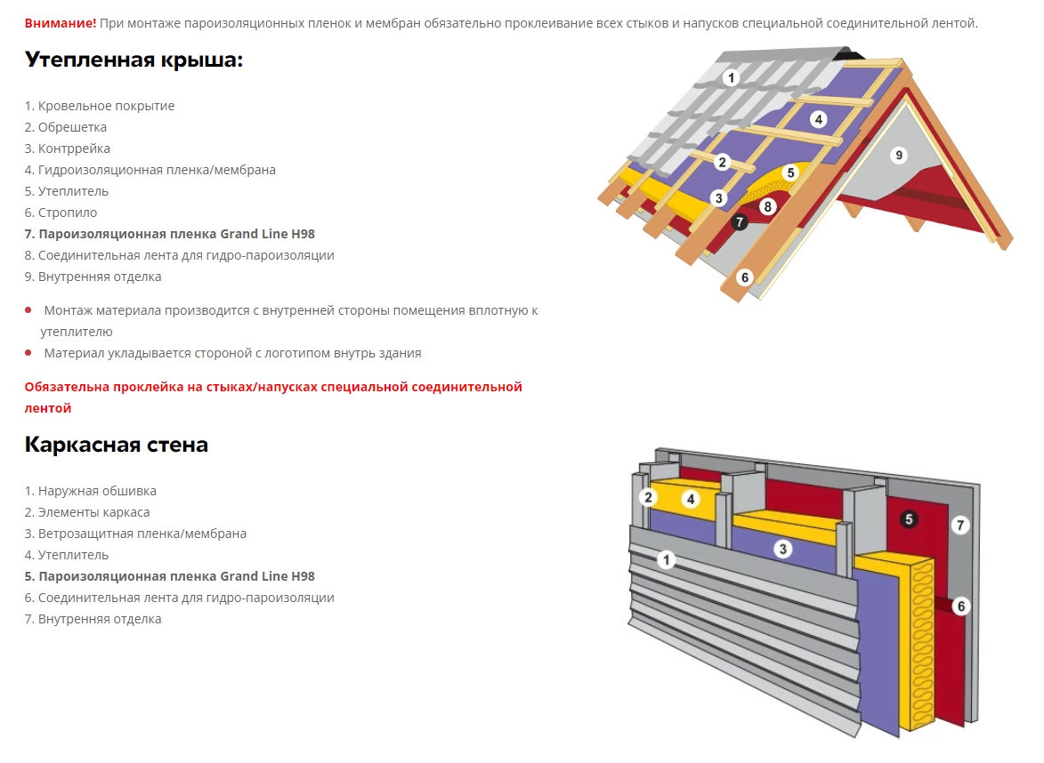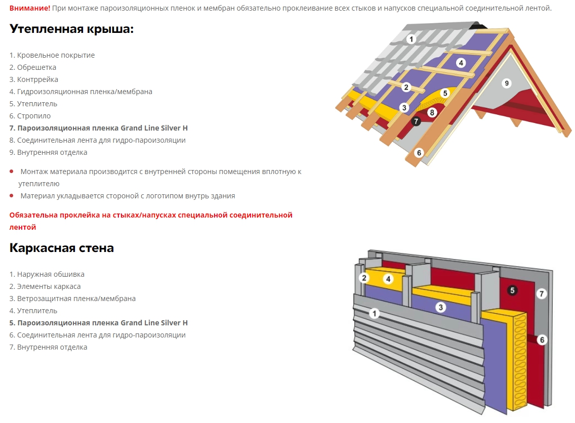 Схема монтажа пароизоляционной пленки Grand Line Silver H + Tape