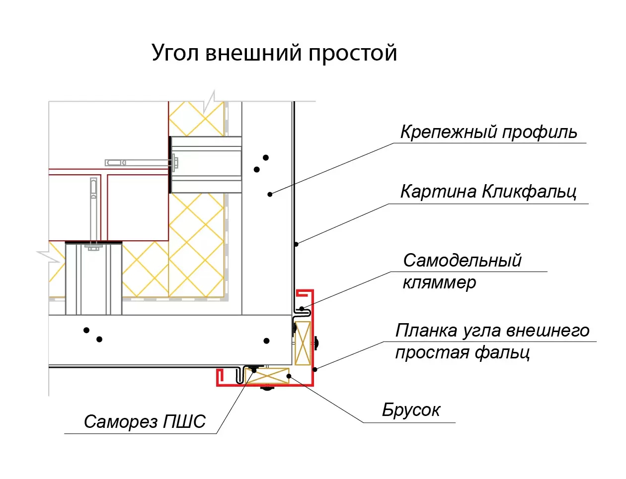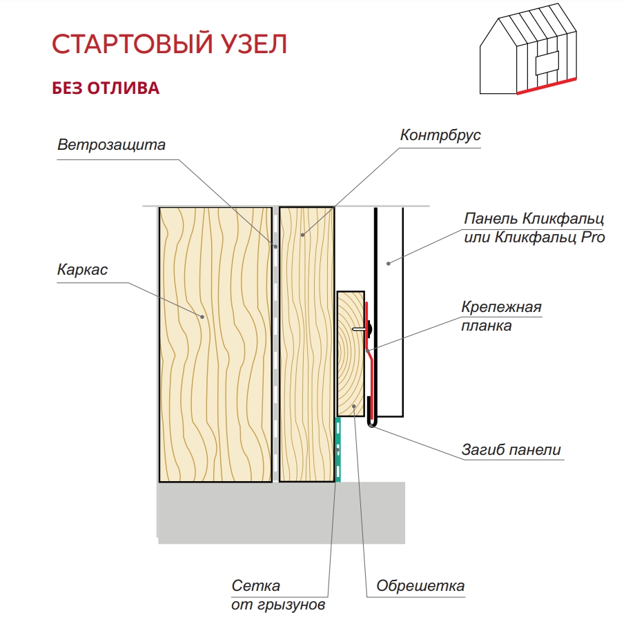 Стартовый узел без отлива на фасаде из панелей Кликфальц, Кликфальц PRO