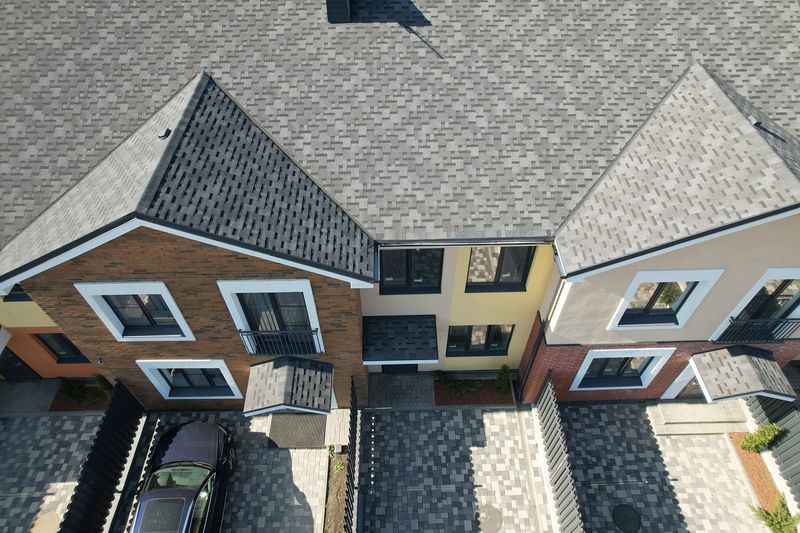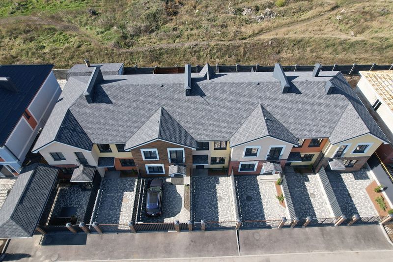 Черепица выполнена в глубоких графитовых оттенках. Она хорошо смотрится с фасадами в светлых холодных и теплых оттенках. Удачными будут и комбинации с насыщенными цветами, например, сайдингом «слива», «персик», «голубика».